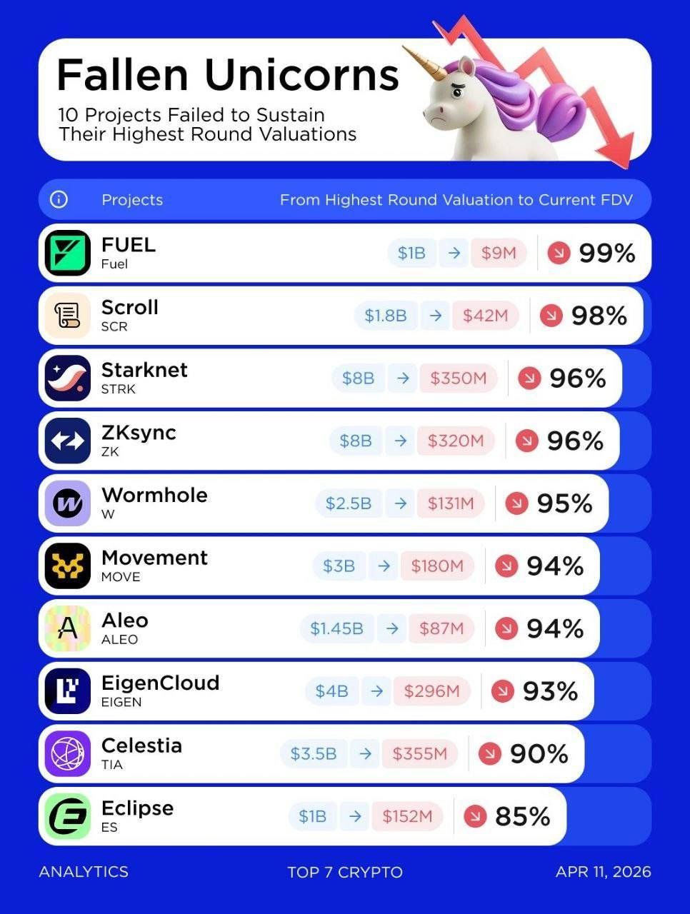 Several once highly valued crypto projects, have seen steep valuation declines, with some falling 85–99% from peak funding-round valuations to current FDV.