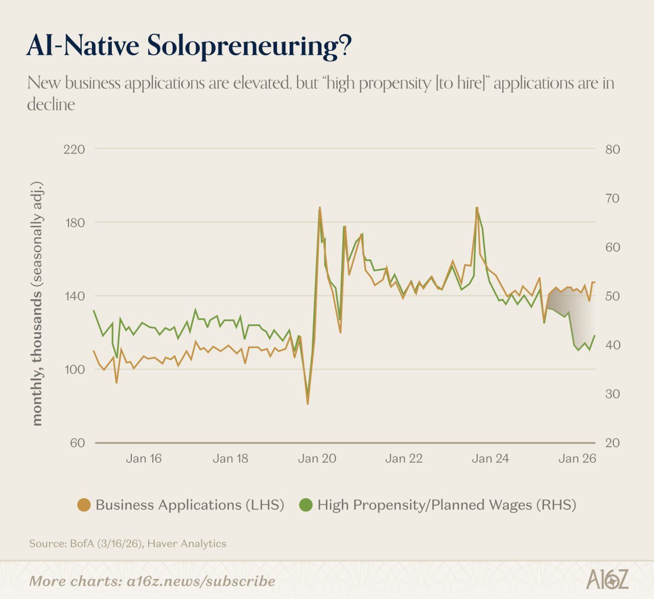 New data shows business applications rising while high-propensity-to-hire startups decline, pointing to a potential shift toward AI-driven solo ventures, according to an a16z report.