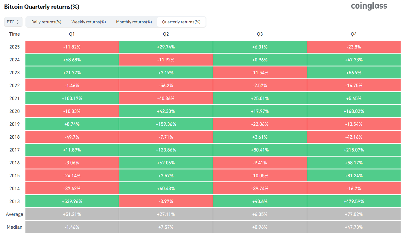 BTC is down 24% so far in Q4, performing worse than in 2022 and 2019.