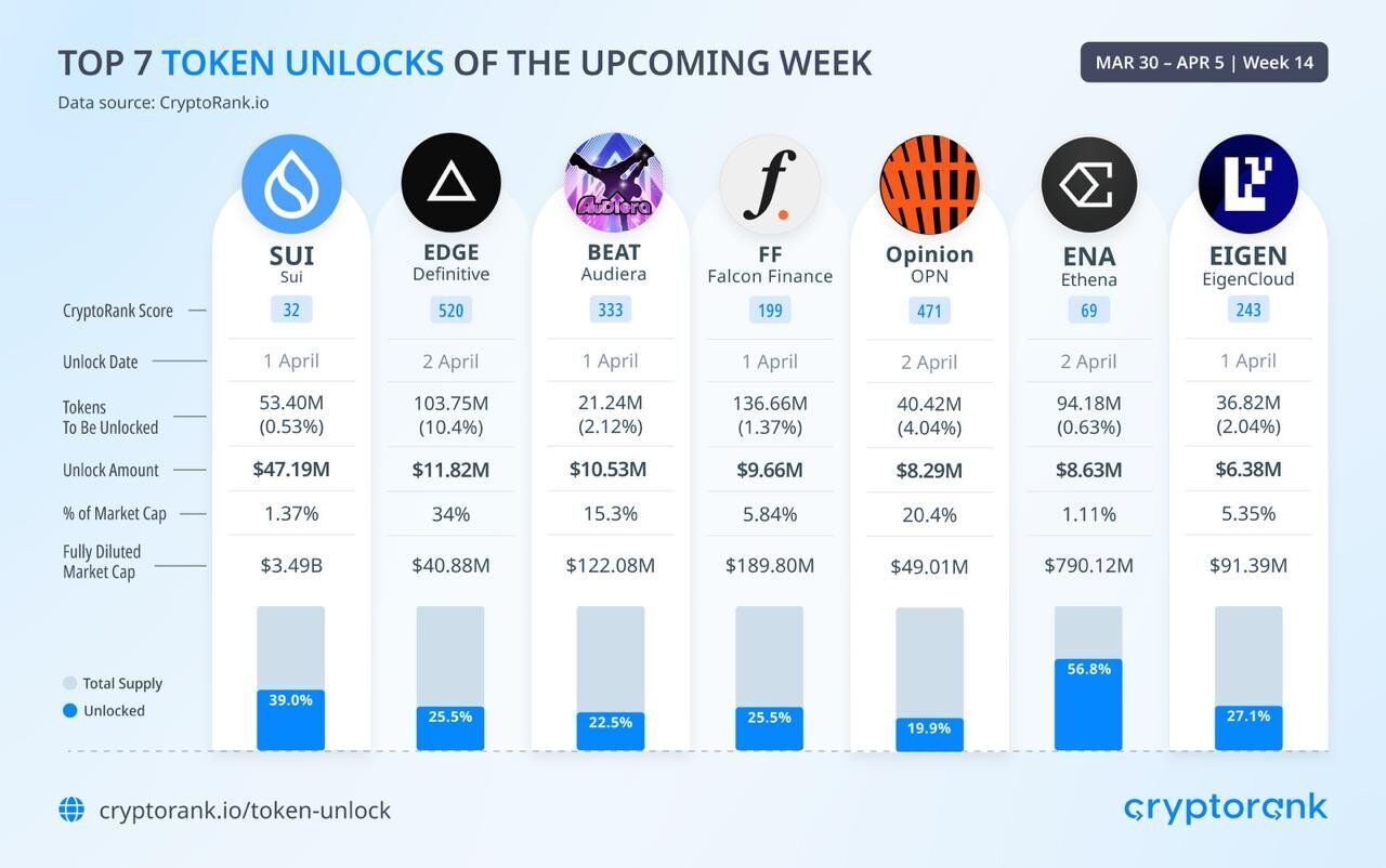 According to CryptoRank, multiple token unlocks are scheduled this week, with a large percentage of market cap for assets like EDGE (34%) and OPINION (20.4%), signaling potential volatility.