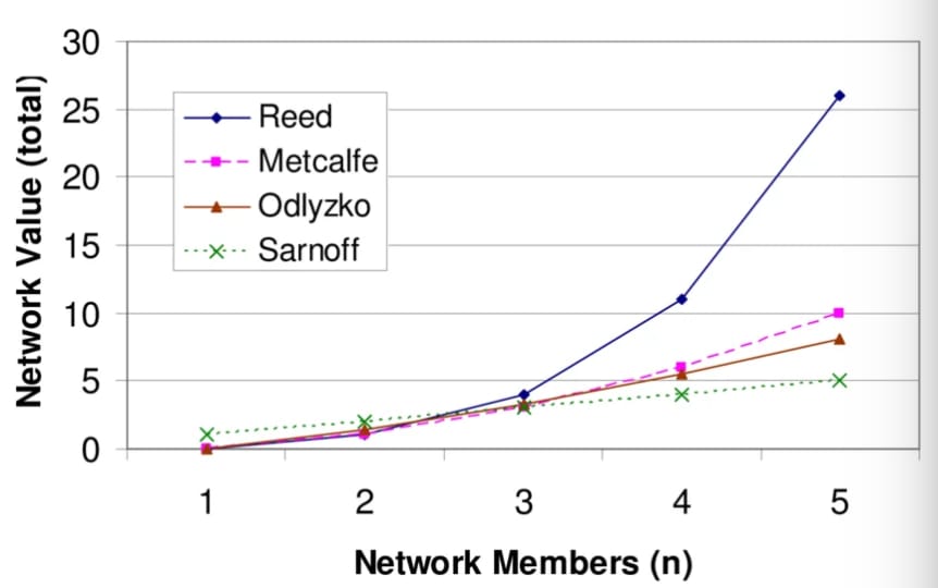 The chart shows how network value scales under different models: Sarnoff’s grows linearly, Odlyzko’s slightly faster than linear, Metcalfe’s quadratically, and Reed’s exponentially. Applied to crypto, Metcalfe’s Law suggests value rises as adoption spreads, while Reed’s Law implies many user groups grow the network’s value through compounded network effects.