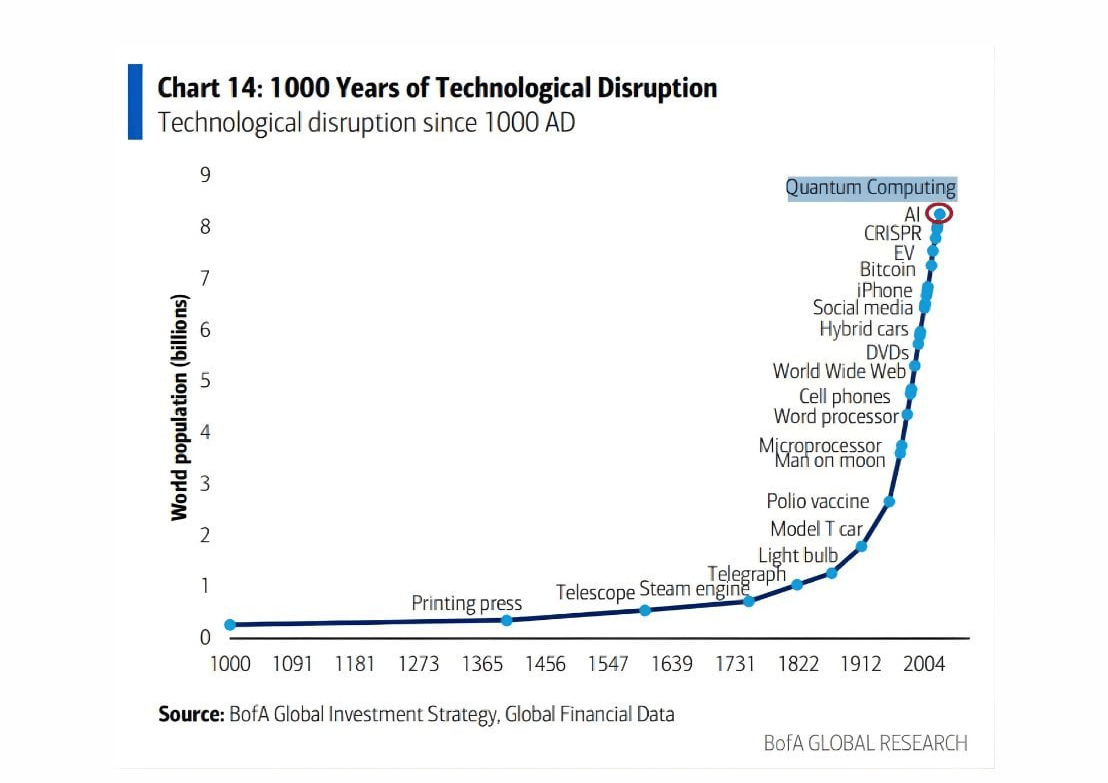 Technological disruption is accelerating rapidly, with Bitcoin, AI, and quantum computing emerging among the latest major innovations shaping the next era of advancement.