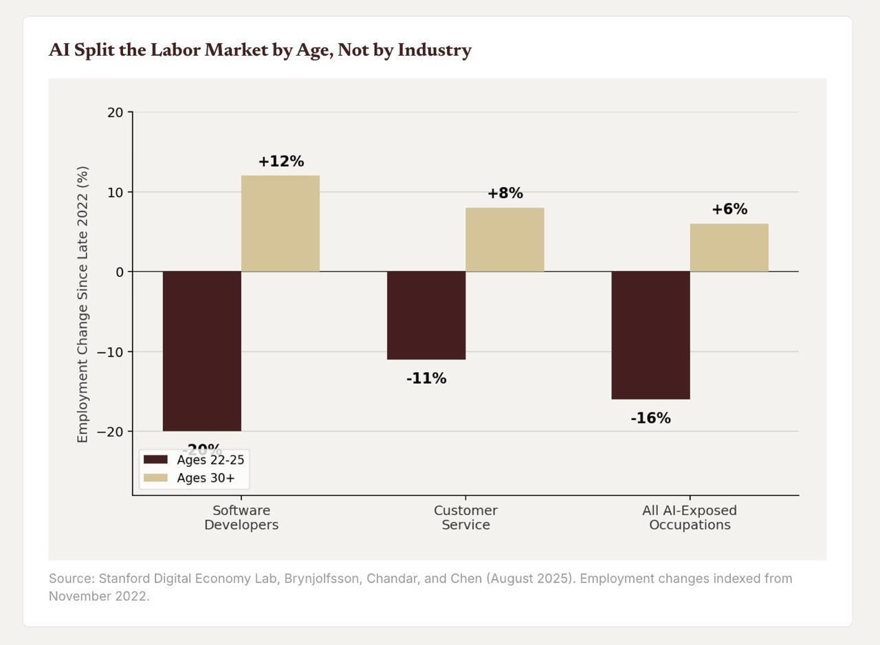Employment trends suggest AI may be affecting the labor market by age more than by industry, with workers ages 22 to 25 declining across AI-exposed occupations.