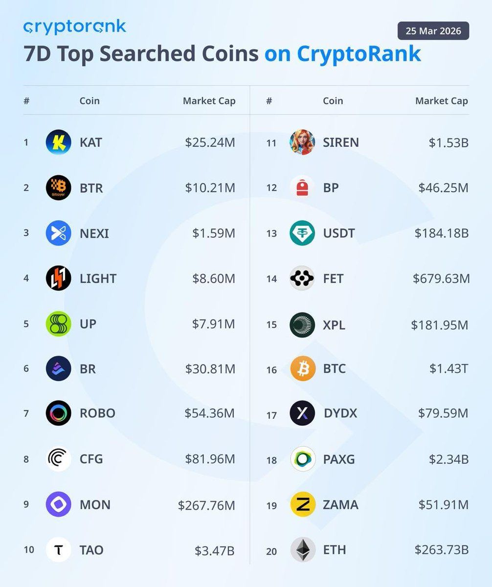 Search trends on CryptoRank highlight rising attention on smaller-cap tokens alongside major players, signaling shifting momentum across the crypto market.