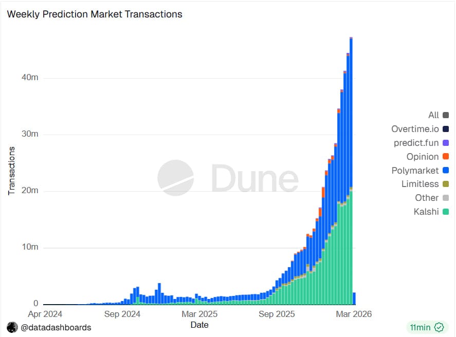 Prediction market activity has surged since late 2025, reaching a record 47.26 million weekly transactions in Q1 2026 so far, driven largely by Polymarket and Kalshi, according to Dune data.