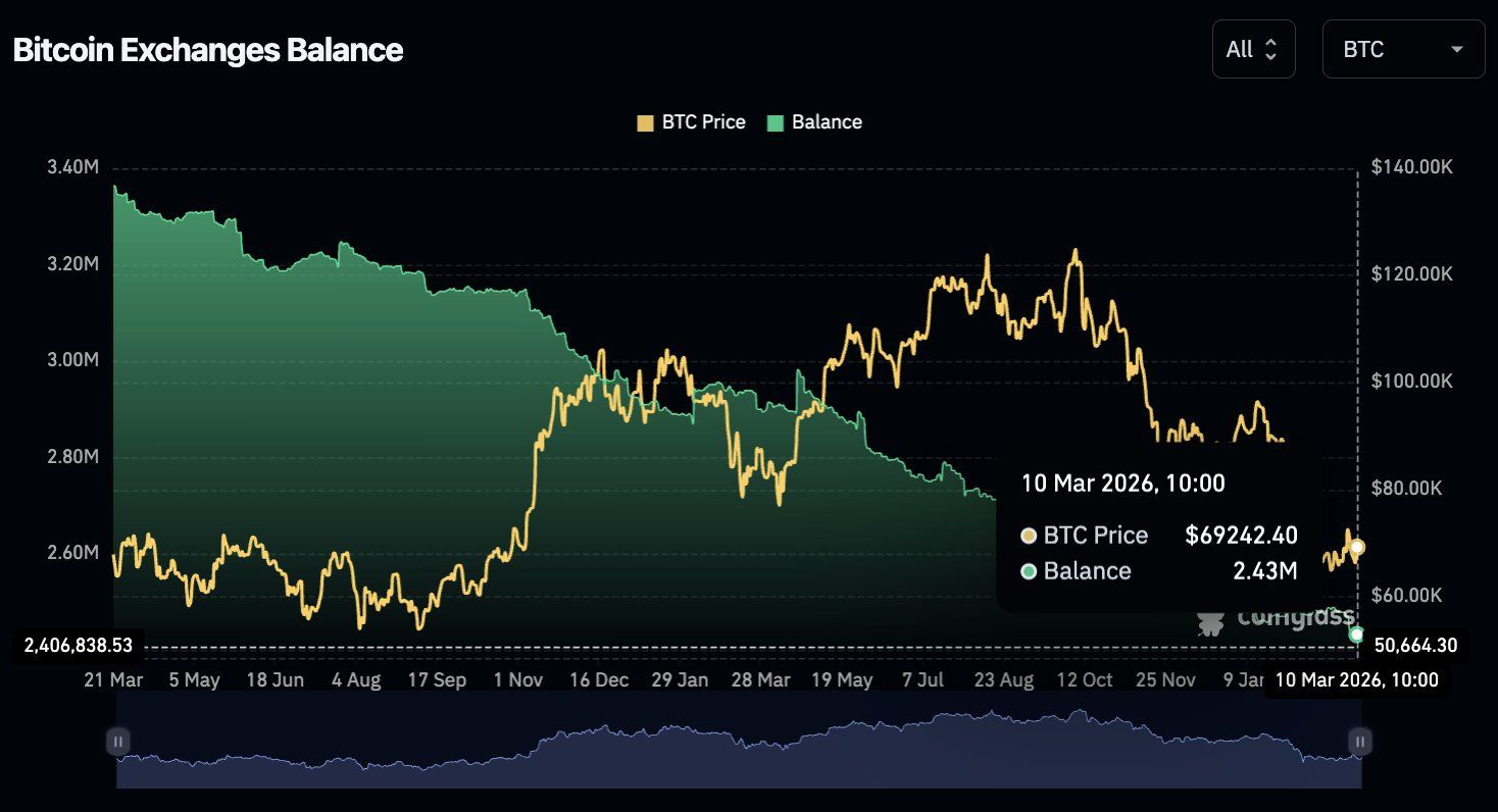 Bitcoin held on exchanges has dropped to about 2.43 million BTC, suggesting reduced sell pressure and continued accumulation despite recent price volatility.
